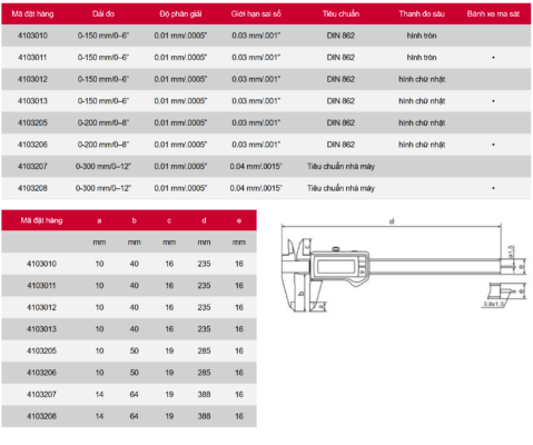 - Dải đo (mm): 0 – 150 / 1 – 200 / 1 – 300