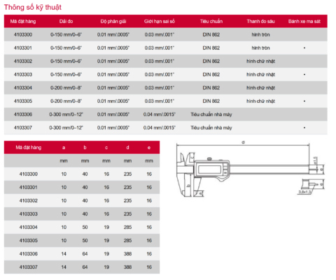 - Dải đo (mm): 0 – 150 / 0 – 200 / 0 – 300